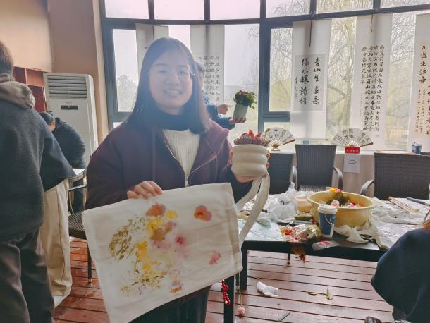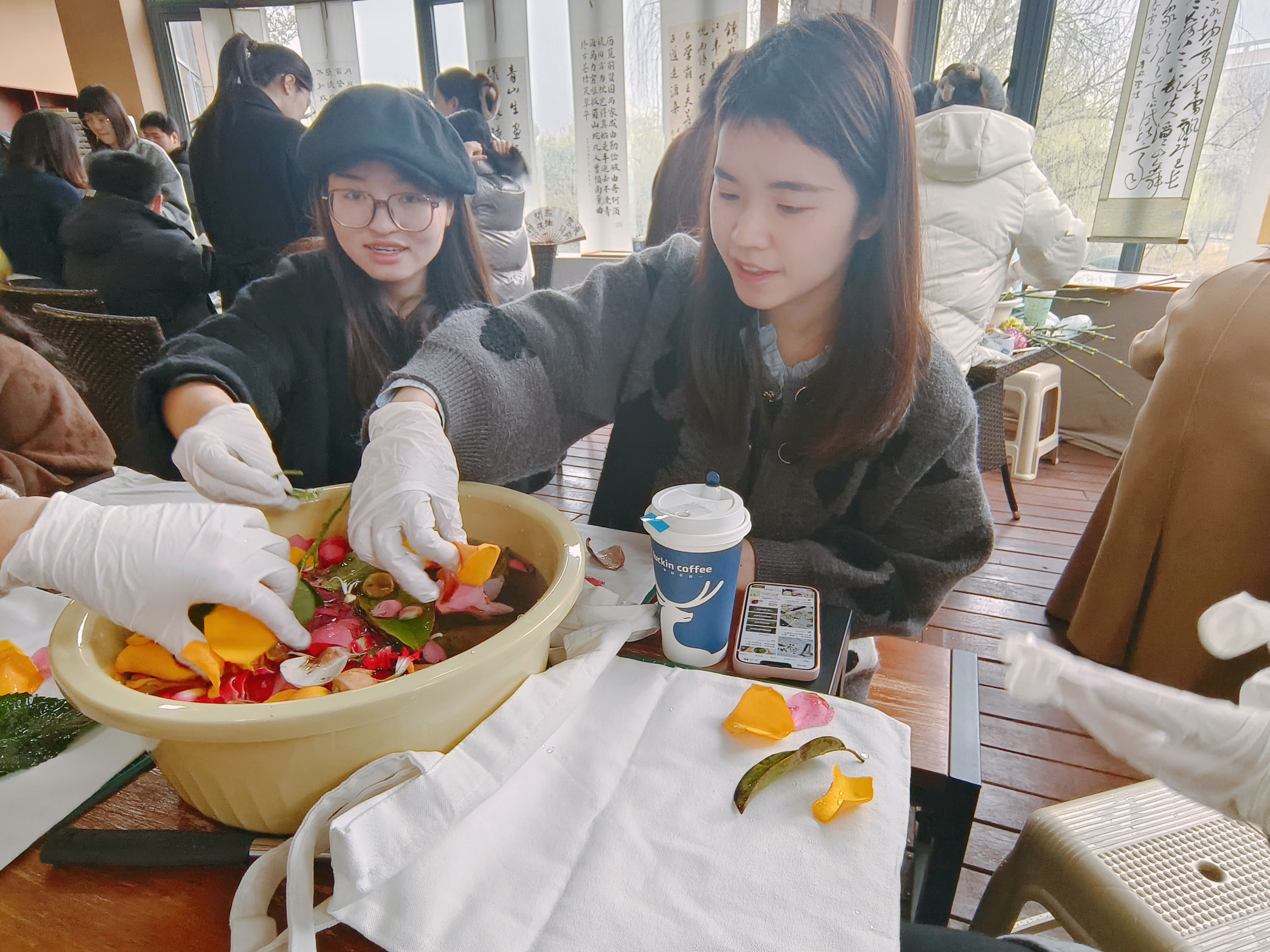 辅导员温从乐开展现场教学,解说清洗、固色、晾干、拓印等拓染工序。活动现场,员工们热烈交流、共同动手,一起浸泡绿植和花朵,讨论帆布袋图案,此起彼伏的敲击声在现场跃动,自然的神奇造化在帆布上徐徐舒展。经过近两个小时的创作,20余件作品得以成形展示,每件作品的背后都承载着独一无二的设计理念。活动最后,每一位参与的员工领取了精心准备的绿植盆栽,让大家把春天带回宿舍,活动在欢声笑语中圆满结束。