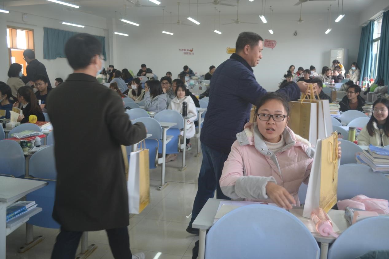 谈话过后,老师们们向同学们分发了牛奶、咖啡、文具等礼物,并合影留念,为紧张的考研征程上增添别样的温暖。