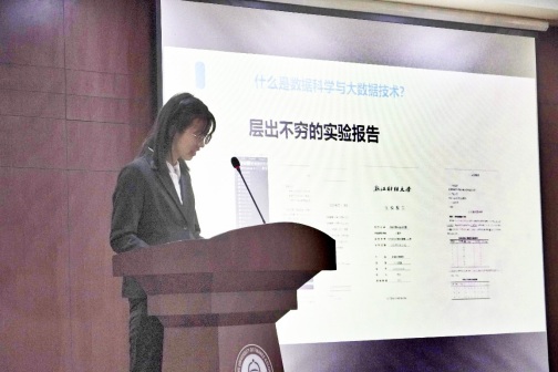 最后,浙江省海洋知识创新大赛特等奖团队登台分享他们的实战经历。这支团队创造了公司在该赛事上的最好成绩,同时也体现了数据学子勇于跨学科、跨领域开展探索与应用的创新精神。