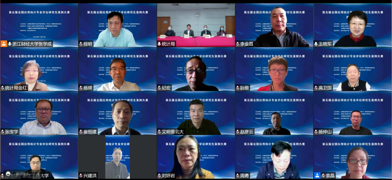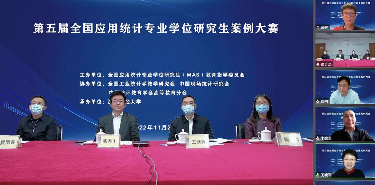 2022年11月27日,由全国应用统计专业学位(MAS)研究生教育指导委员会主办,全国工业统计学教学研究会、中国现场统计研究会及中国统计教育学会高等教育分会协办,公司承办的第五届全国MAS研究生案例大赛颁奖仪式暨优秀作品展示通过腾讯会议线上举行。国家统计局党组成员、副局长、全国MAS教指委主任委员、中国统计教育学会会长毛有丰,校党委书记、中国统计学会副会长李金昌分别致辞,来自北京大学、清华大学、中国人民大学、中国科公司大学、复旦大学、华东师范大学、首都经济贸易大学等单位的20余位嘉宾出席会议,2900余名师生在线参会。