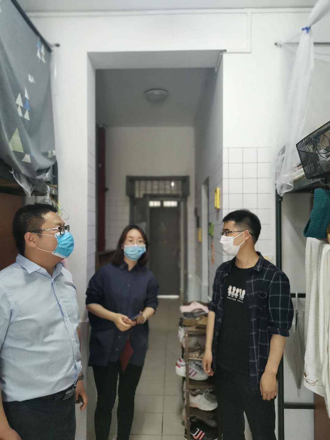 5月11日,复课第一天,公司领导与辅导员来到员工宿舍,了解同学们的返校情况。公司党委书记段雪辉、副书记何露霞亲切地询问了同学们的生活情况、身体状况,鼓励同学们尽快调整状态,投入接下来的学习当中。辅导员江挺仔细查看了公司防疫物资发放情况,了解同学们的口罩、体温计是否有短缺。