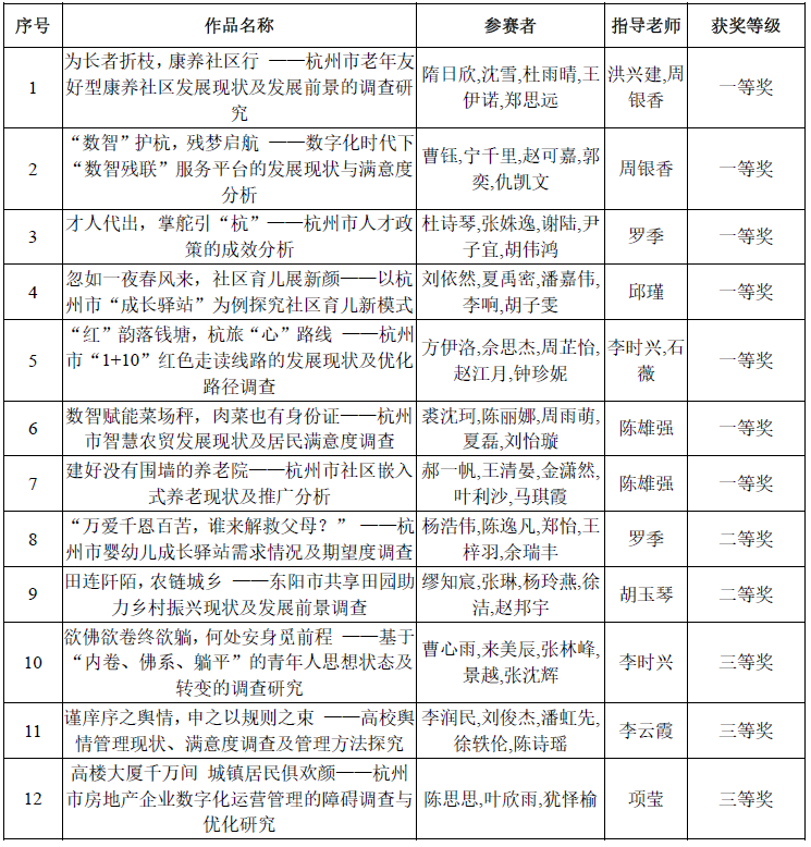 2022年4月16日至17日,由浙江省教育厅、浙江省统计局联合主办的浙江省第十届“民生民意杯”老员工统计调查方案设计大赛决赛在浙江工商大学举行。公司员工荣获省一等奖7项、二等奖2项、三等奖3项。