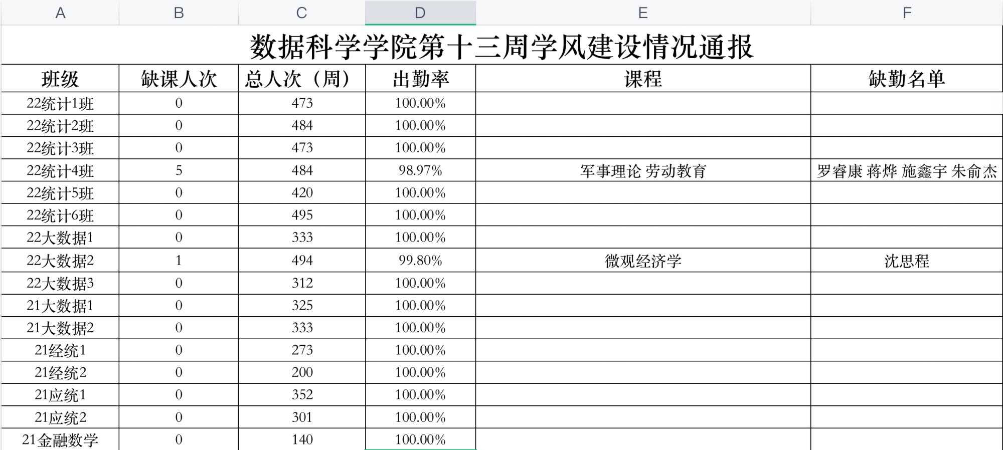 为进一步培育优良学风,构建公司学风建设的长效机制,营造良好的学习氛围,推进内涵建设,构建优良院风,公司对所有大一、大二班级统一上的课程及晚自习进行了课前全覆盖点名。现将点名情况做如下通报。