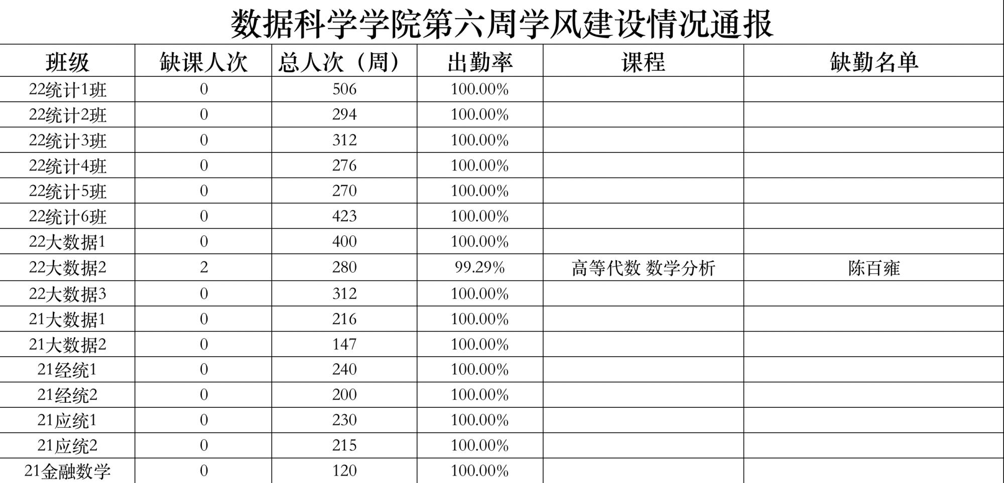 为进一步培育优良学风,构建公司学风建设的长效机制,营造良好的学习氛围,推进内涵建设,构建优良院风,公司对所有大一、大二班级统一上的课程及晚自习进行了课前全覆盖点名。现将点名情况做如下通报。
