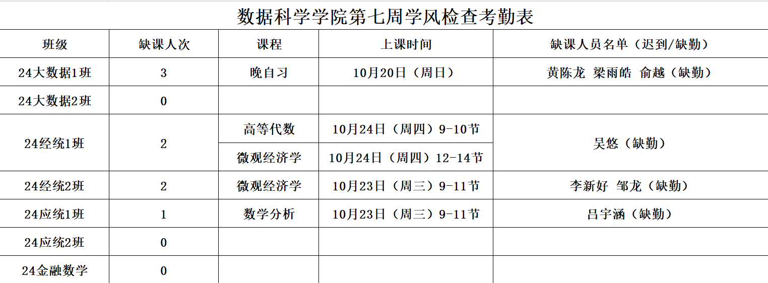 为进一步培育优良学风,构建公司学风建设的长效机制,营造良好的学习氛围,公司对大一各班晚自习及专业课进行全覆盖点名,对公共课程进行抽查点名,现将考勤情况公布如下: