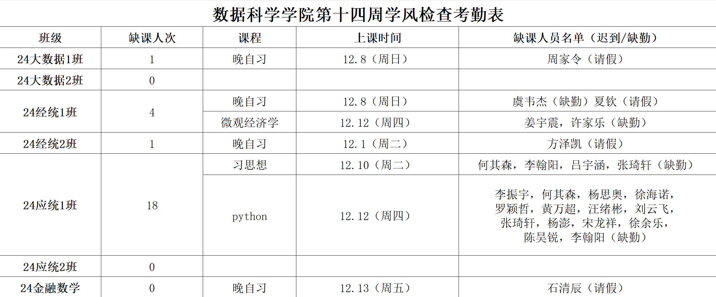 为进一步培育优良学风,构建公司学风建设的长效机制,营造良好的学习氛围,公司对大一各班晚自习及专业课进行全覆盖点名,对公共课程进行抽查点名,现将考勤情况公布如下: