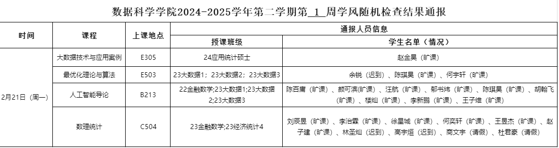 2月21日上午,公司员工工作办公室开展新学期第一周学风督察工作,对研究生、本科生各班级的员工前排就座情况,课堂考勤、纪律及听课情况等进行随机检查,现将本次随机检查结果通报如下: