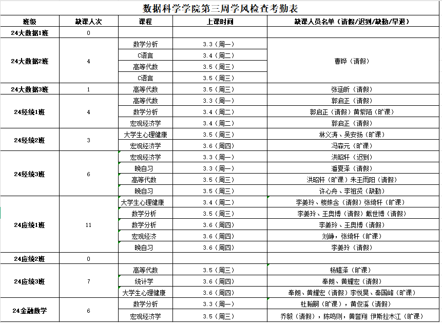 公司员工工作办公室开展新学期第3周学风督察工作,对本科生各班级的员工前排就座情况,课堂考勤、纪律及听课情况等进行随机检查,现将本次随机抽结果通报如下: