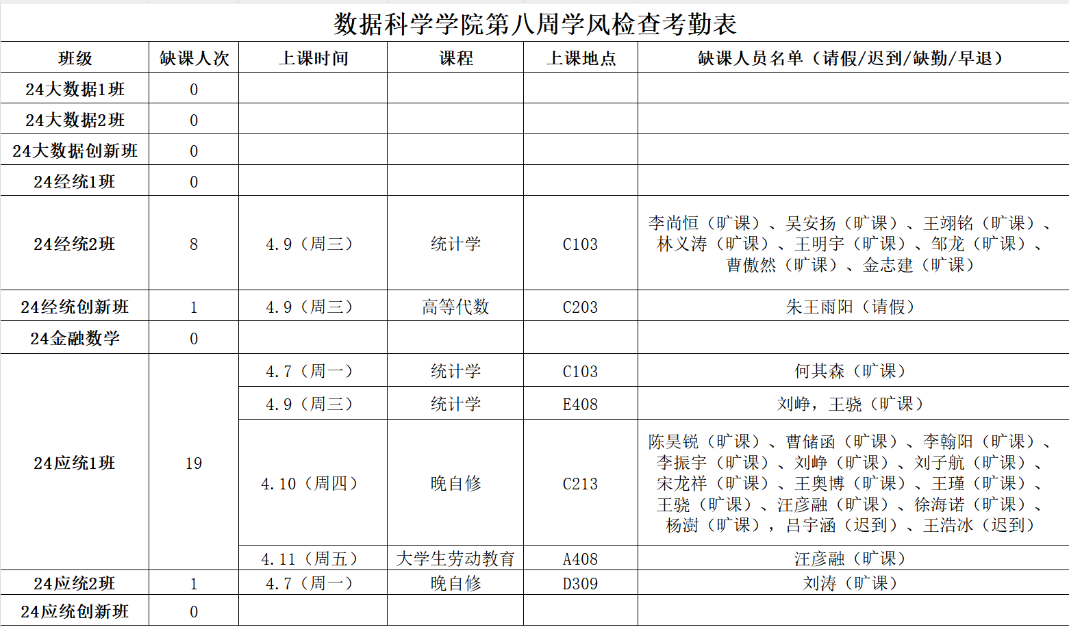 公司员工工作办公室开展新学期第8周学风督察工作,对本科生各班级的员工前排就座情况,课堂考勤、纪律及听课情况等进行随机检查,现将本次随机抽结果通报如下: