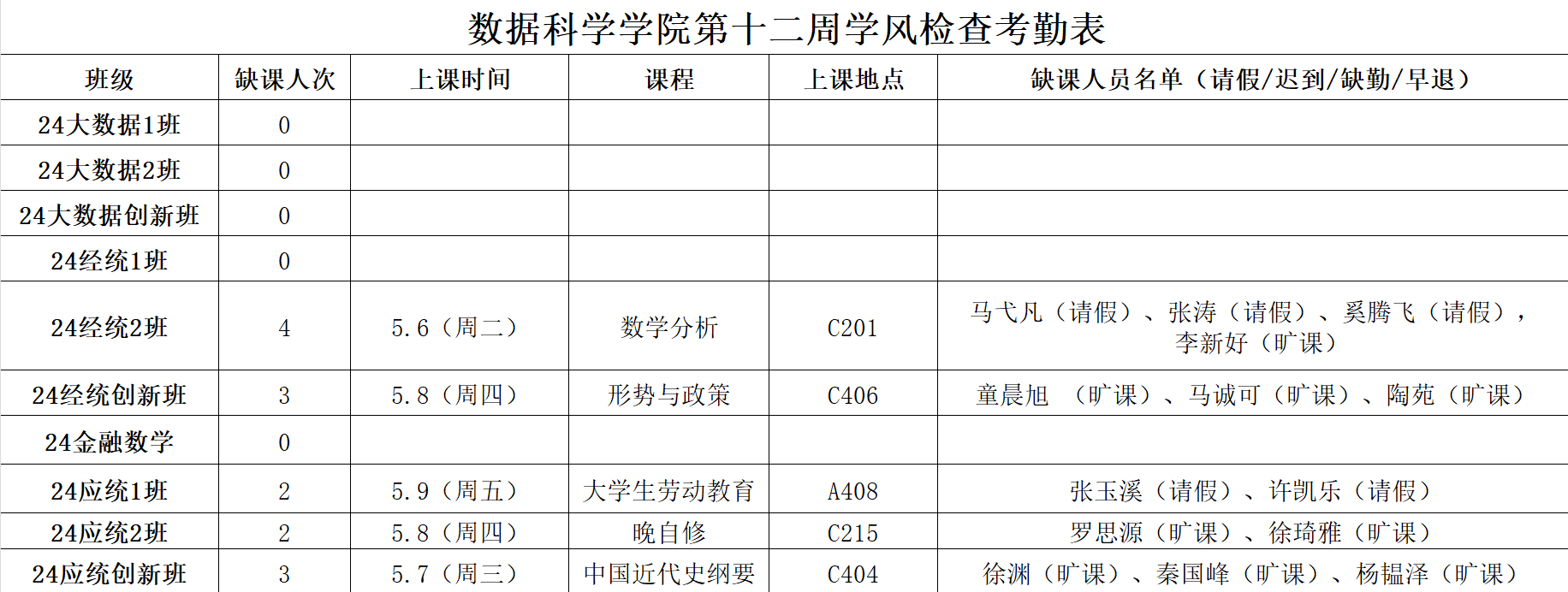 公司员工工作办公室开展第12周学风督察工作,对本科生各班级的员工前排就座情况,课堂考勤、纪律及听课情况等进行随机检查,现将本次随机抽查结果通报如下: