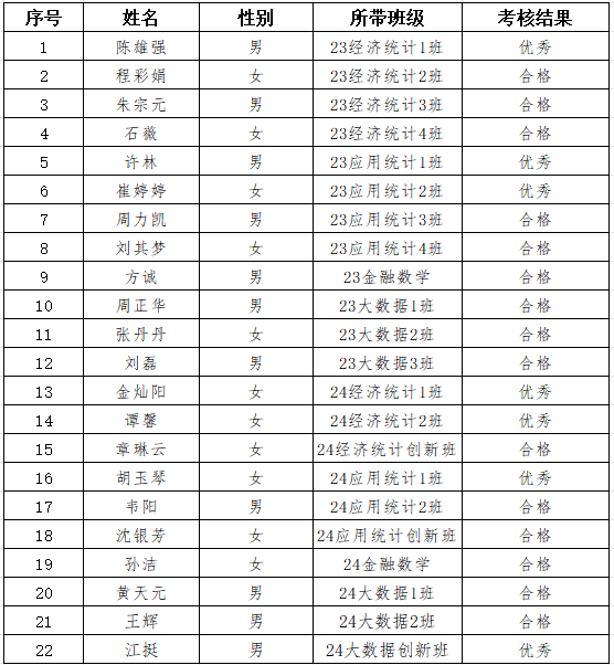 根据公司《永利集团官网本科生班主任工作实施办法(修订)》(浙财大党〔2024〕47号)和《关于开展2024-2025学年本科生班主任考核暨校级优秀班主任推荐的通知》要求,公司组织开展了2024-2025学年班主任工作考核,经员工打分、公司量化评分等程序,确定考核为“优秀”等次7人、“合格”等次15人。现将班主任工作考核优秀等次、合格等次人员名单予以公示,详见如下: