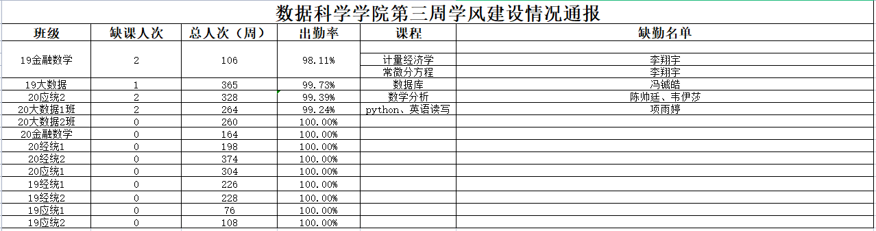 为进一步培育优良学风,构建公司学风建设的长效机制,营造良好的学习氛围,推进内涵建设,构建优良院风,公司对所有大一、大二班级统一上的课程进行了课前全覆盖点名。现将点名情况做如下通报。