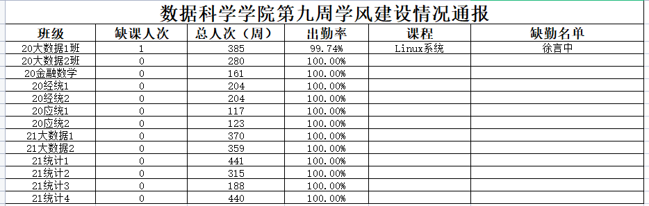 为进一步培育优良学风,构建公司学风建设的长效机制,营造良好的学习氛围,推进内涵建设,构建优良院风,公司对所有大一、大二班级统一上的课程及晚自习进行了课前全覆盖点名。现将点名情况做如下通报。