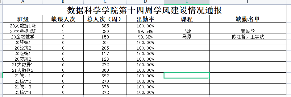 为进一步培育优良学风,构建公司学风建设的长效机制,营造良好的学习氛围,推进内涵建设,构建优良院风,公司对所有大一、大二班级统一上的课程及晚自习进行了课前全覆盖点名。现将点名情况做如下通报。