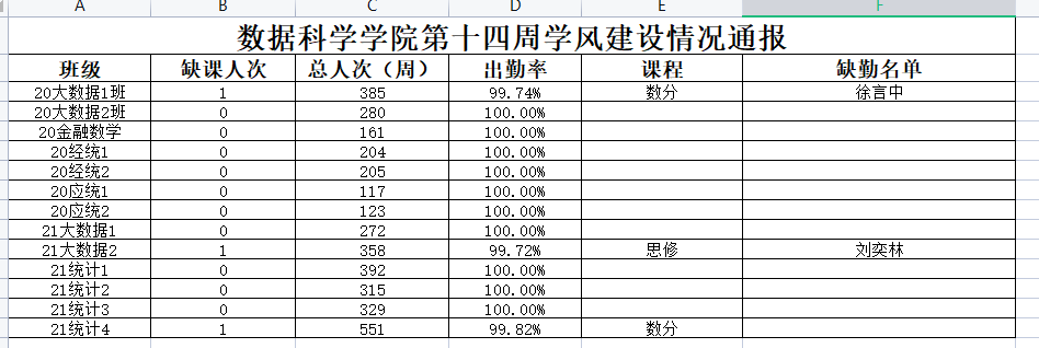 为进一步培育优良学风,构建公司学风建设的长效机制,营造良好的学习氛围,推进内涵建设,构建优良院风,公司对所有大一、大二班级统一上的课程及晚自习进行了课前全覆盖点名。现将点名情况做如下通报。