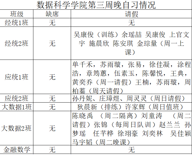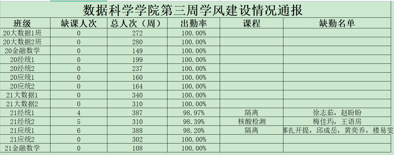 为进一步培育优良学风,构建公司学风建设的长效机制,营造良好的学习氛围,推进内涵建设,构建优良院风,公司对所有大一、大二班级统一上的课程及晚自习进行了课前全覆盖点名。现将点名情况做如下通报。