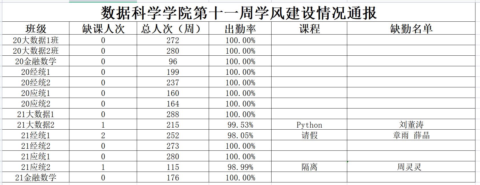 为进一步培育优良学风,构建公司学风建设的长效机制,营造良好的学习氛围,推进内涵建设,构建优良院风,公司对所有大一、大二班级统一上的课程及晚自习进行了课前全覆盖点名。现将点名情况做如下通报。