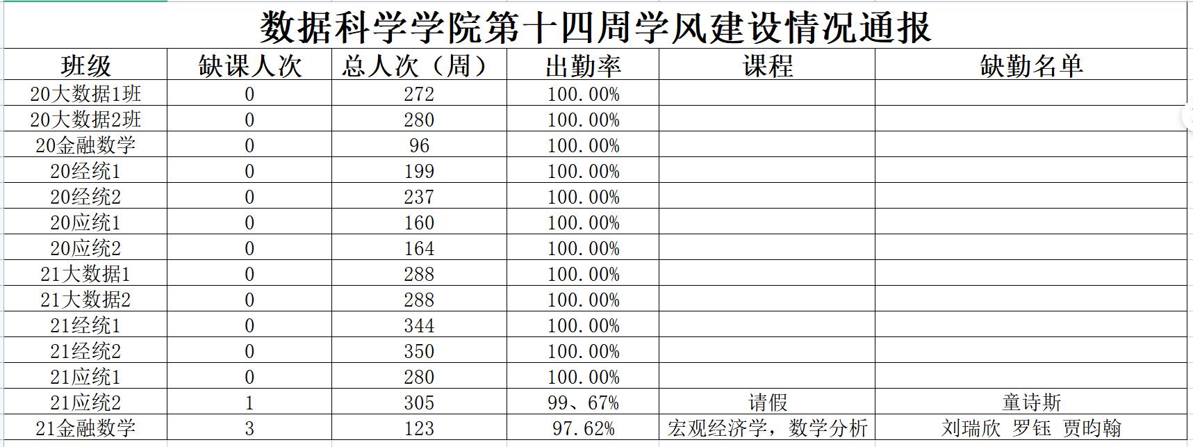 为进一步培育优良学风,构建公司学风建设的长效机制,营造良好的学习氛围,推进内涵建设,构建优良院风,公司对所有大一、大二班级统一上的课程及晚自习进行了课前全覆盖点名。现将点名情况做如下通报。