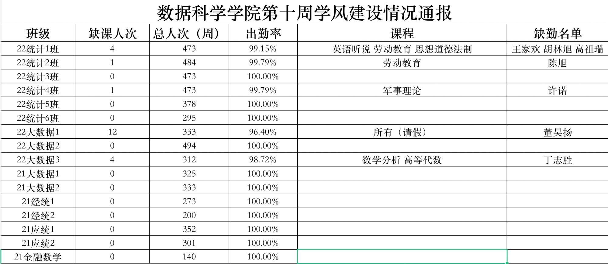 为进一步培育优良学风,构建公司学风建设的长效机制,营造良好的学习氛围,推进内涵建设,构建优良院风,公司对所有大一、大二班级统一上的课程及晚自习进行了课前全覆盖点名。现将点名情况做如下通报。