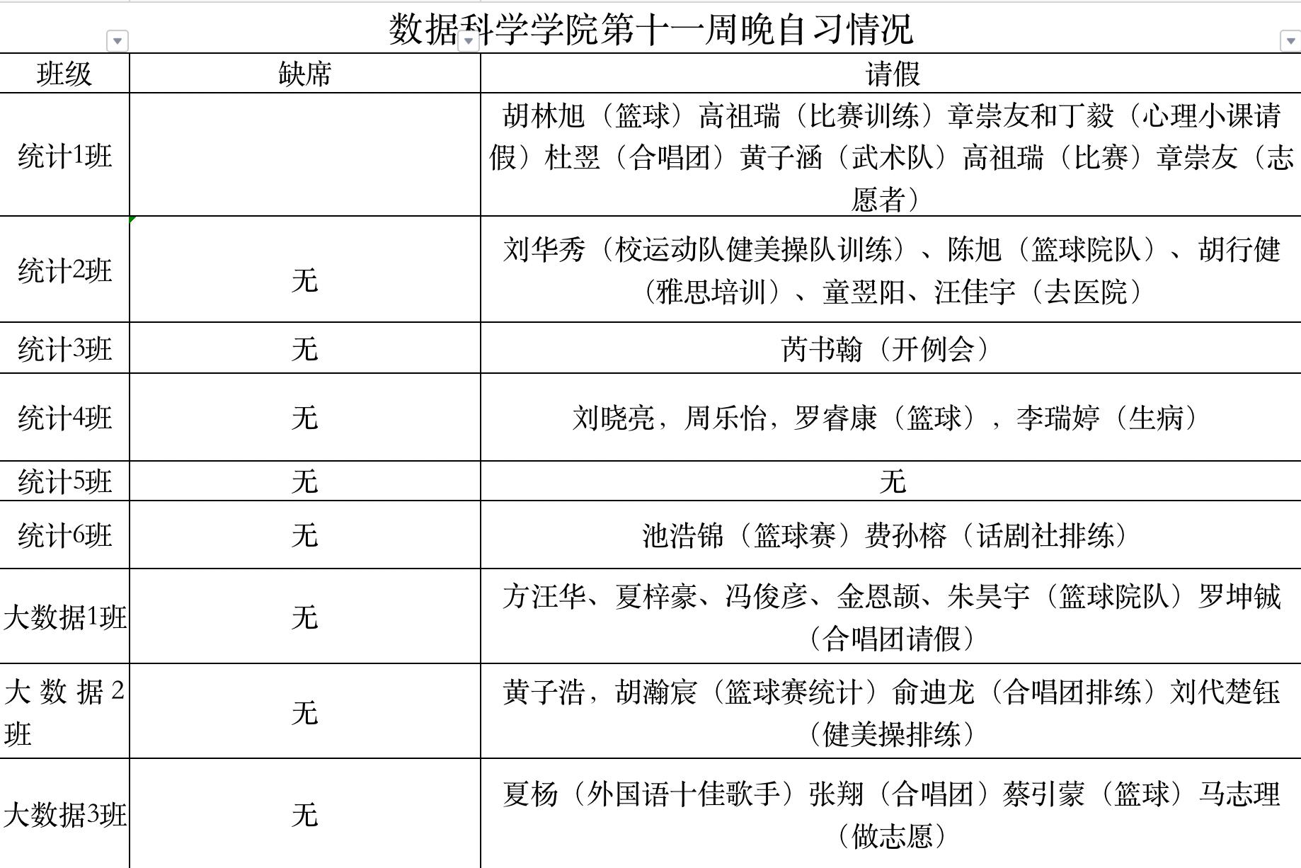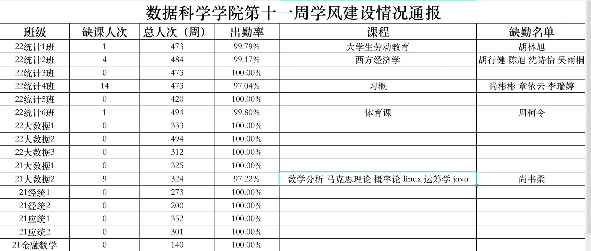 为进一步培育优良学风,构建公司学风建设的长效机制,营造良好的学习氛围,推进内涵建设,构建优良院风,公司对所有大一、大二班级统一上的课程及晚自习进行了课前全覆盖点名。现将点名情况做如下通报。