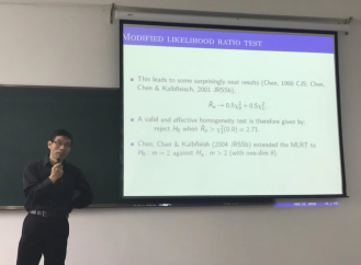 报告会上,陈家骅教授首先通过介绍有限混合模型的研究背景、研究意义,给出有限混合模型的基本形式以及模型的适用情况,并指出常规传统的混合分布是并不完善。随后,陈家骅教授提出改进的似然比检验和EM检验方法,它对有限的单变量正态分布混合和其他几种混合具有整齐的解,效果较普通混合模型更优。