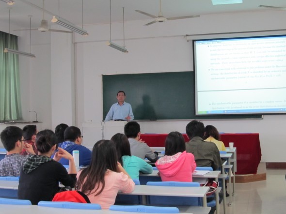 报告会上,周宪教授首先细致地讲解了他近期的文章,他提出了一种新的信度估计方法,该方法可以应用于一般保险中的保费厘定。新方法提供了一个基于任意保费原理之下的经验保费厘定框架,在他的框架下,经典的Buhlmann和Ferguson原理都是其一个特例,该方法同时还克服了上述保费厘定准则的一些缺点。然后,周宪老师还和在场师生进行了讨论,耐心地回答了师生们的问题。