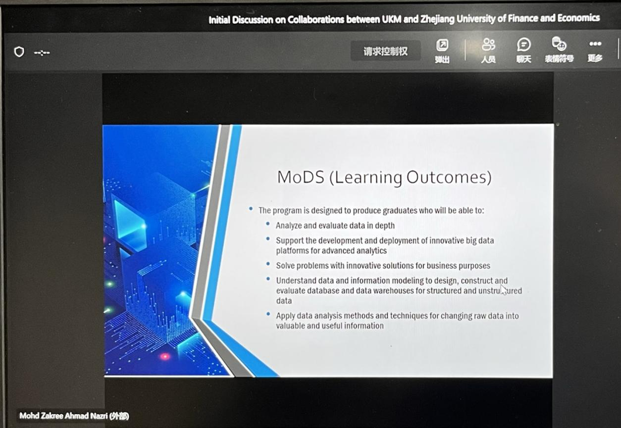 会上,双方围绕拟合作项目展开讨论,就联合培养硕士研究生项目交换意见和建议,初步达成联合建设数据科学硕士研究生项目的合作意向。本次交流会为未来与马来西亚国立大学联合培养硕士研究生打下了坚实基础,进一步促进了公司中外合作办学项目的落地实践。