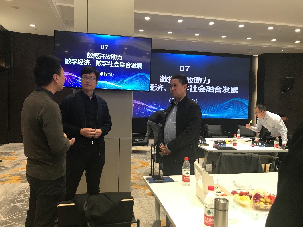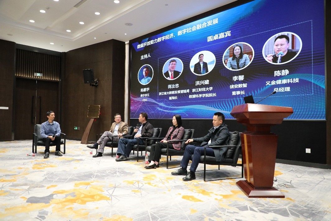 在沙龙的圆桌讨论环节,洪兴建与浙江省大数据发展管理局副局长蒋汝忠,信安数智董事长李馨以及义金健康科技总经理陈静分享和讨论了数据开放和应用创新在各自领域的实践与探索,同时还就数据开放共享过程中的数据安全问题、高校如何在数据开放共享、应用创新中发挥优势等问题上发表了各自的看法。