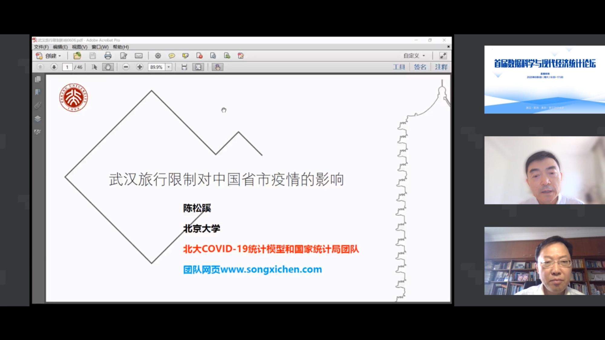 第二场报告由上海对外经贸大学董事长汪荣明教授主持,来自北京大学的光华管理公司商务统计与经济计量系主任陈松蹊教授围绕“武汉旅行限制对中国各省市疫情的影响”作主题报告,重点阐述了人流管控的重要性并对输入病例进行了深入探讨。