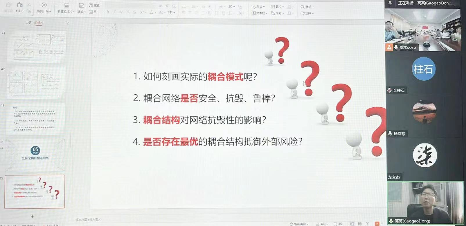 10月26日下午,江苏大学董高高教授应邀为公司师生作了一场题为“耦合相依网络的安全抗毁性分析”的线上学术讲座。讲座由yl永利集团官网登录郑松教授主持,公司部分老师及研究生参加了讲座。
