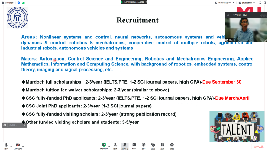 12月5日下午,澳大利亚莫道克大学王海副教授应邀为公司师生作了一场题为“Adaptive path tracking control of maize plant protection robot via extreme learning machine”的线上学术讲座。讲座由yl永利集团官网登录张永全教授主持,公司部分老师及研究生参加了讲座。