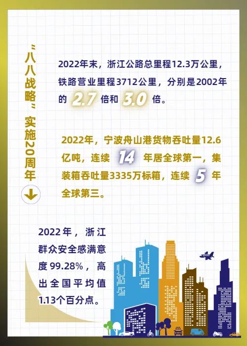 水陆空畅行的立体交通网全面构建。2022年末,浙江公路总里程12.3万公里,铁路营业里程3712公里,分别是2002年的2.7倍和3.0倍。民航机场7个,2022年旅客吞吐量3471万人,货邮吞吐量99万吨。城市轨道交通从无到有,7个设区市投运轨道交通线路达到1000公里。铁路、公路和水运货物周转量13544亿吨公里,港口货物吞吐量19.2亿吨,分别是2022年的8.4倍、7.5倍。宁波舟山港货物吞吐量12.6亿吨,连续14年居全球第一,集装箱吞吐量3335万标箱,连续5年全球第三。