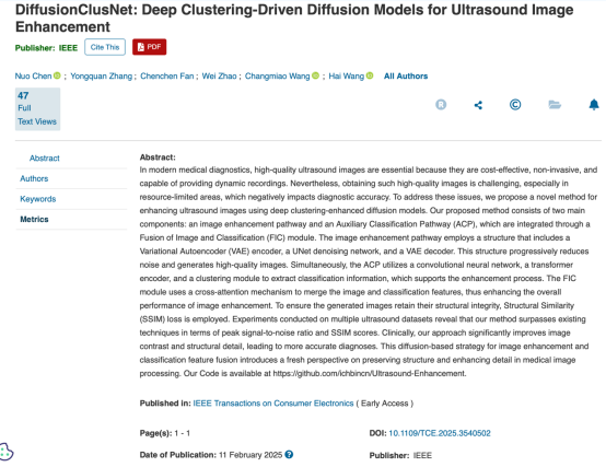 近日,公司2023级大数据统计方法与应用专业硕士研究生陈诺在SCI期刊《IEEE Transactions on Consumer Electronics》(中科院二区,影响因子4.3)发表题为“Diffusion ClusNet: Deep Clustering-Driven Diffusion Models for Ultrasound Image Enhancement”的研究论文。论文由公司张永全教授、澳大利亚莫道克大学王海教授、深圳大数据研究院王昌淼博士共同指导。