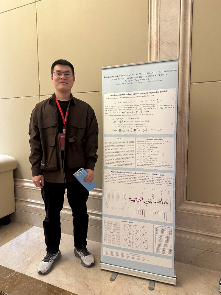 公司23级数理统计学博士生王中正进行了题为“Semiparametric Bayesian regularized quantile regression to mixed effect model for health insurance data”的海报展示。该论文在其导师赵晓兵教授的指导下完成。