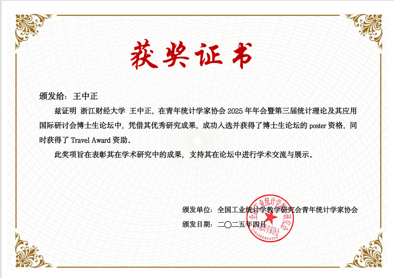 近日,全国工业统计学教学研究会青年统计学家协会年会暨第三届统计理论及其应用国际研讨会在济南隆重召开。公司博士生王中正的论文成功入选博士生论坛,并海报展示其最新的研究成果。